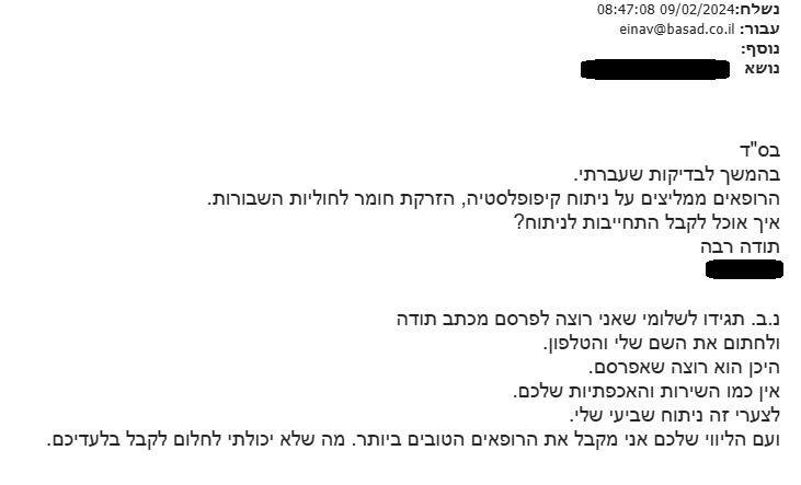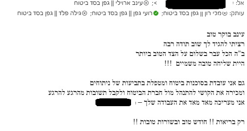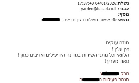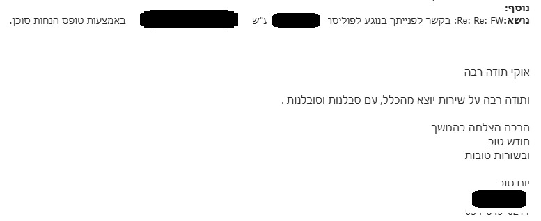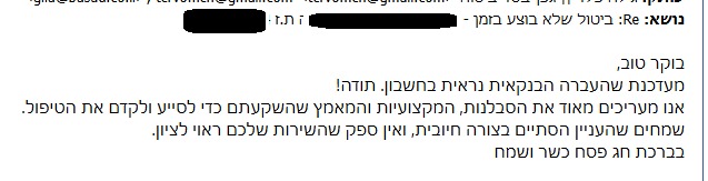 אנו מעריכים מאוד את הסבלנות, המקצועיות והמאמץ שהשקעתם כדי לפעול ולקדם את הטיפול.
